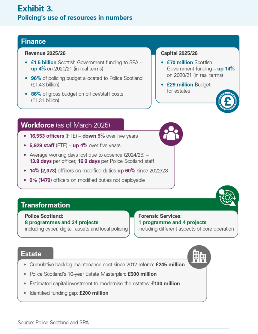 - Police Scotland notes that mental health issues remain the most common cause of long-term absence for officers and staff. In 2024/25, absence cost £80 million for Police Scotland and absence levels remain higher than pre-Covid levels (Exhibit 3, page 21).